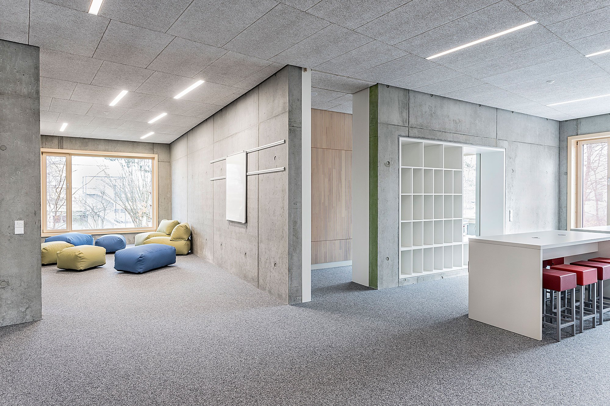 Dadurch entstand eine offene „Lernlandschaft“ mit unterschiedlichsten, flexibel nutzbaren Bereichen, Nischen und Zonen, die trotz Offenheit parallel benutzt werden können.