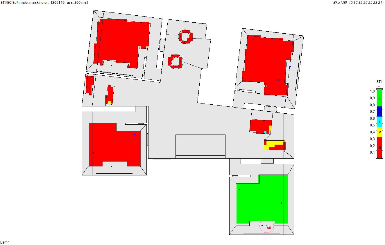den Hintergrundgeräuschpegel, die Nachhallzeit, die Sprachverständlichkeit und weitere raumakustische Kenngrößen.