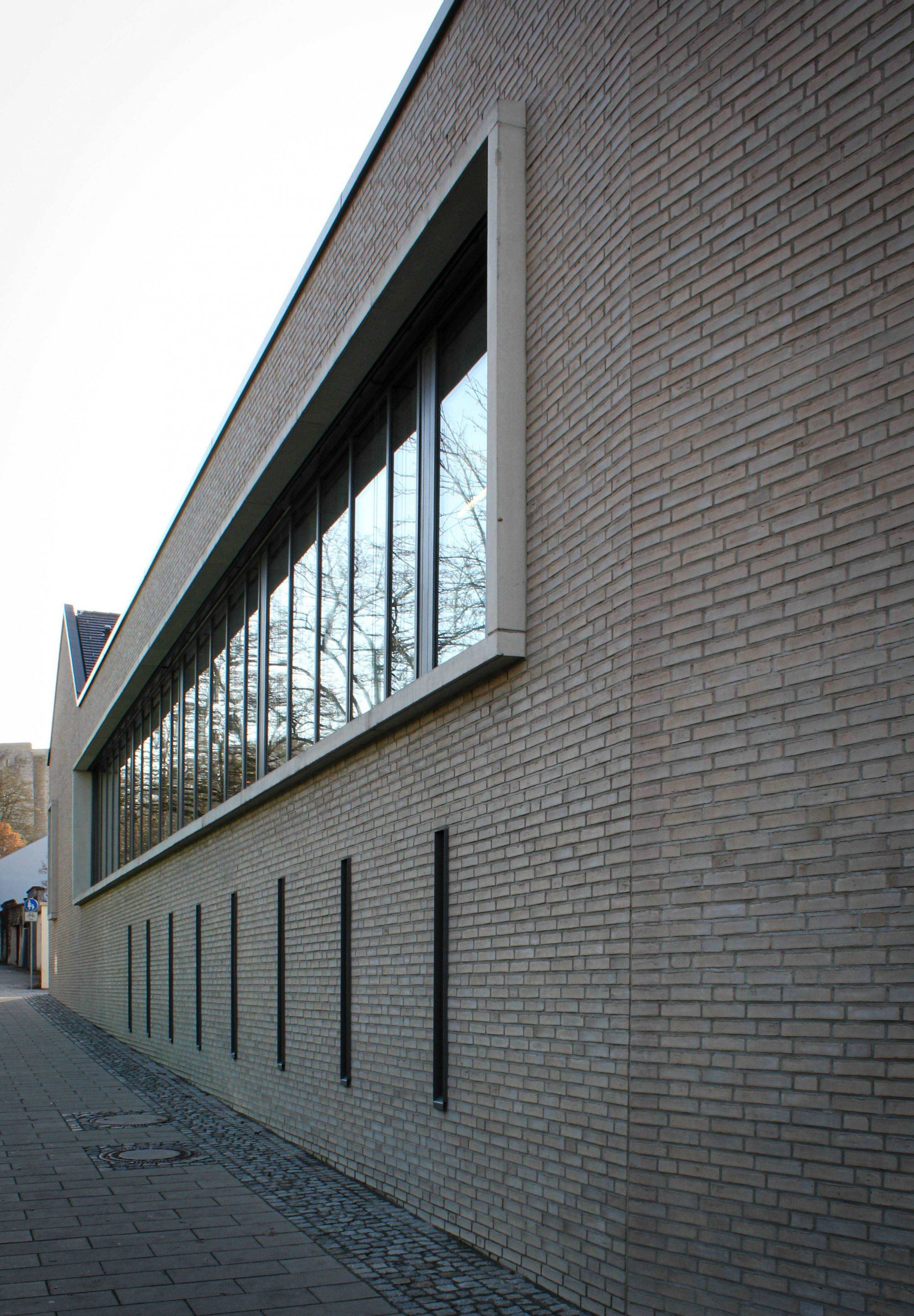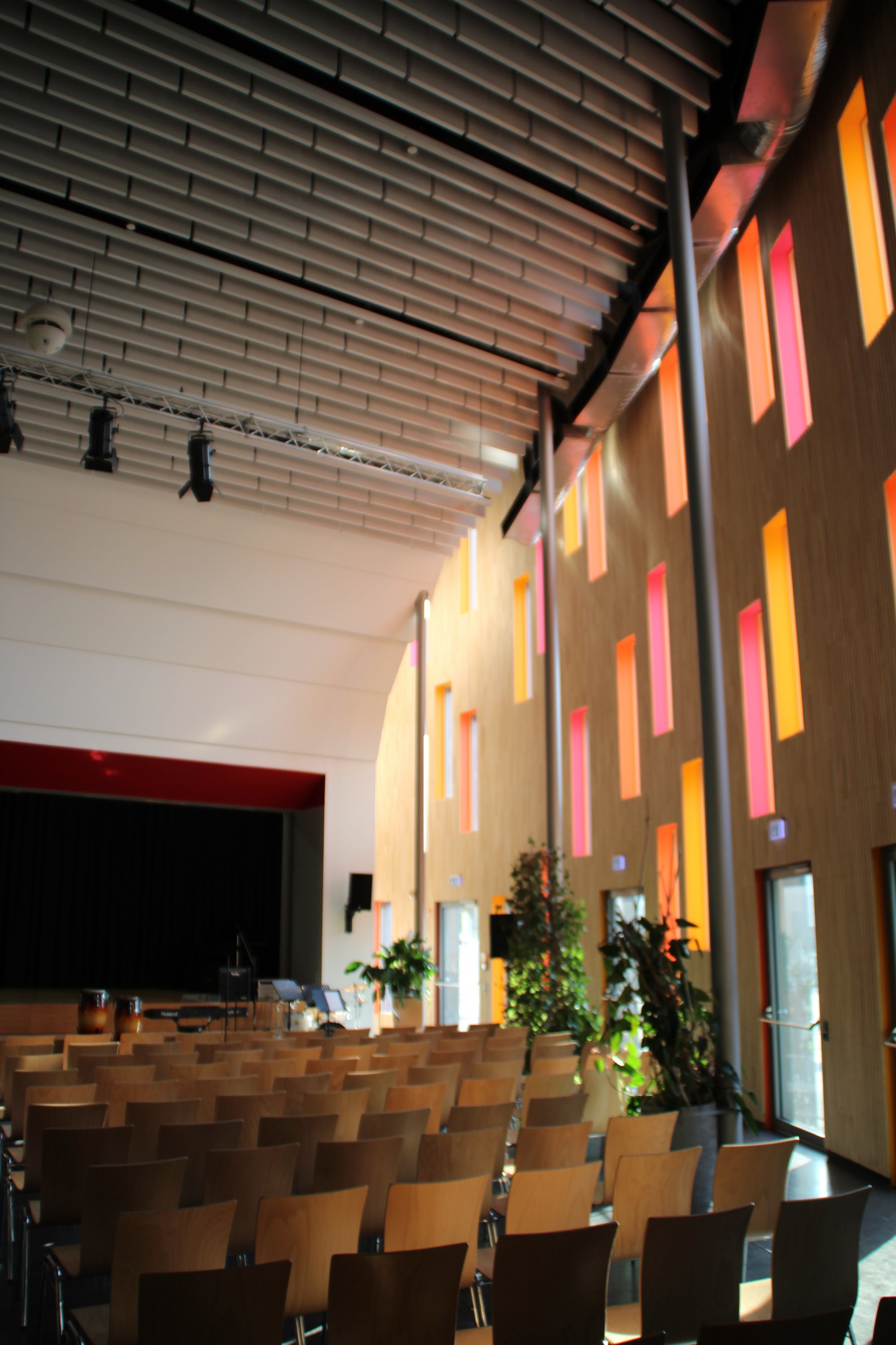 Der neu entstandene Gebäudekomplex gruppiert sich um das zentrale Foyer, von dem aus alle Gebäudeteile erreicht werden können. Auch das Bestandsgebäude ist daran angeschlossen. Das Foyer kann auch für Veranstaltungen genutzt werden und muss dementsprechend raumakustisch ausgestattet sein. Der Schallschutz war eine besondere Aufgabe, da das Gebäude an einer der meistbefahrenen Staßen in Ravensburg liegt und verschiedene Nutzungen (Foyer, Gemeindesaal, Büros und Besprechungsräume) und Kundenverkehr miteinander in Einklang zu bringen waren.